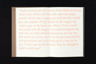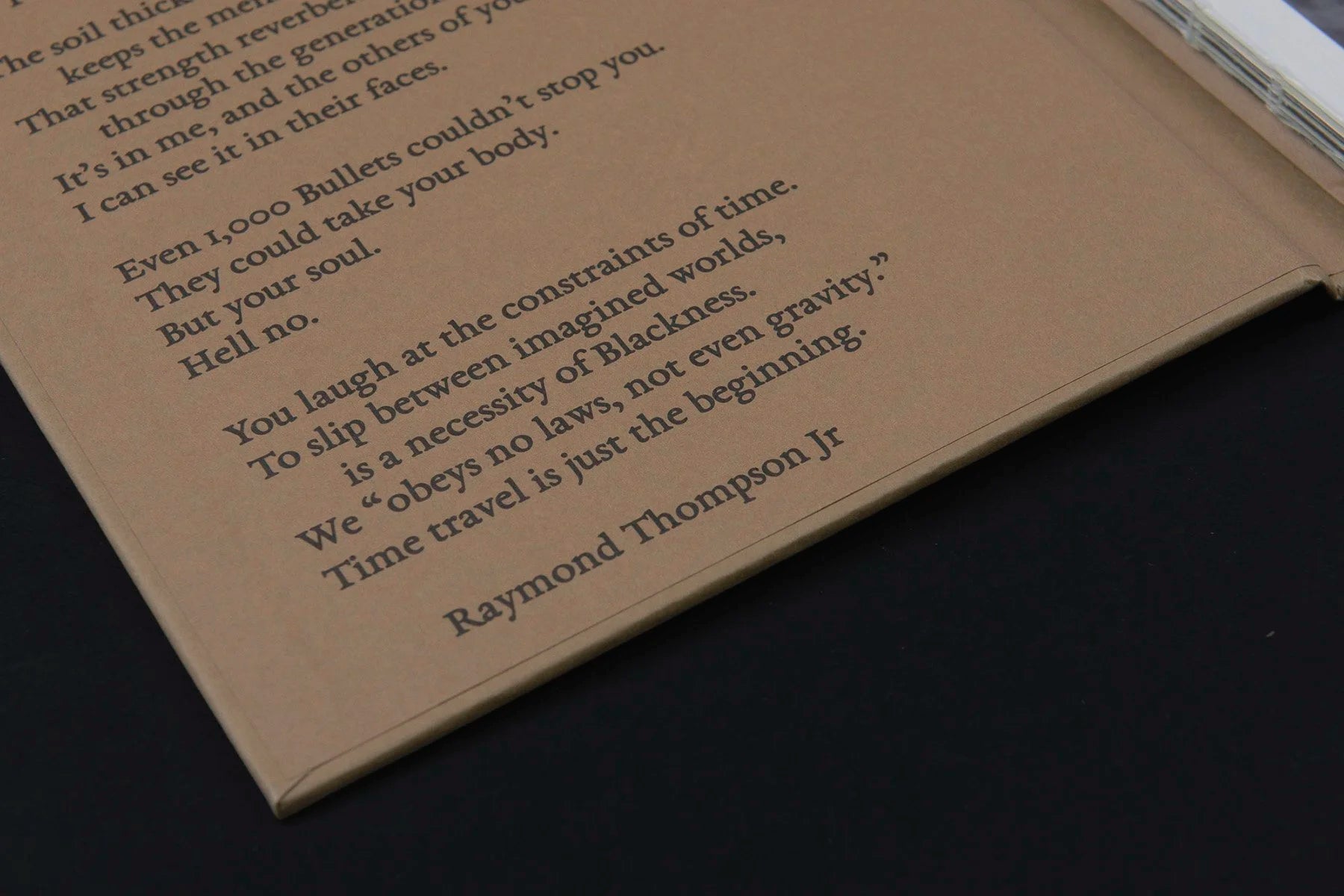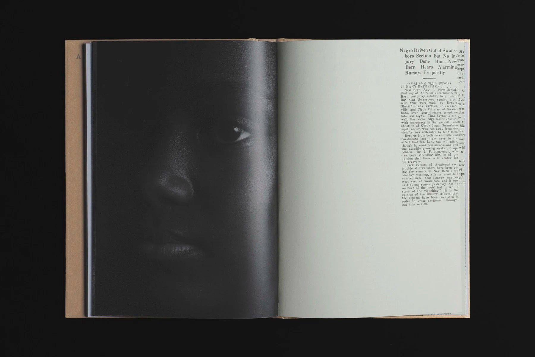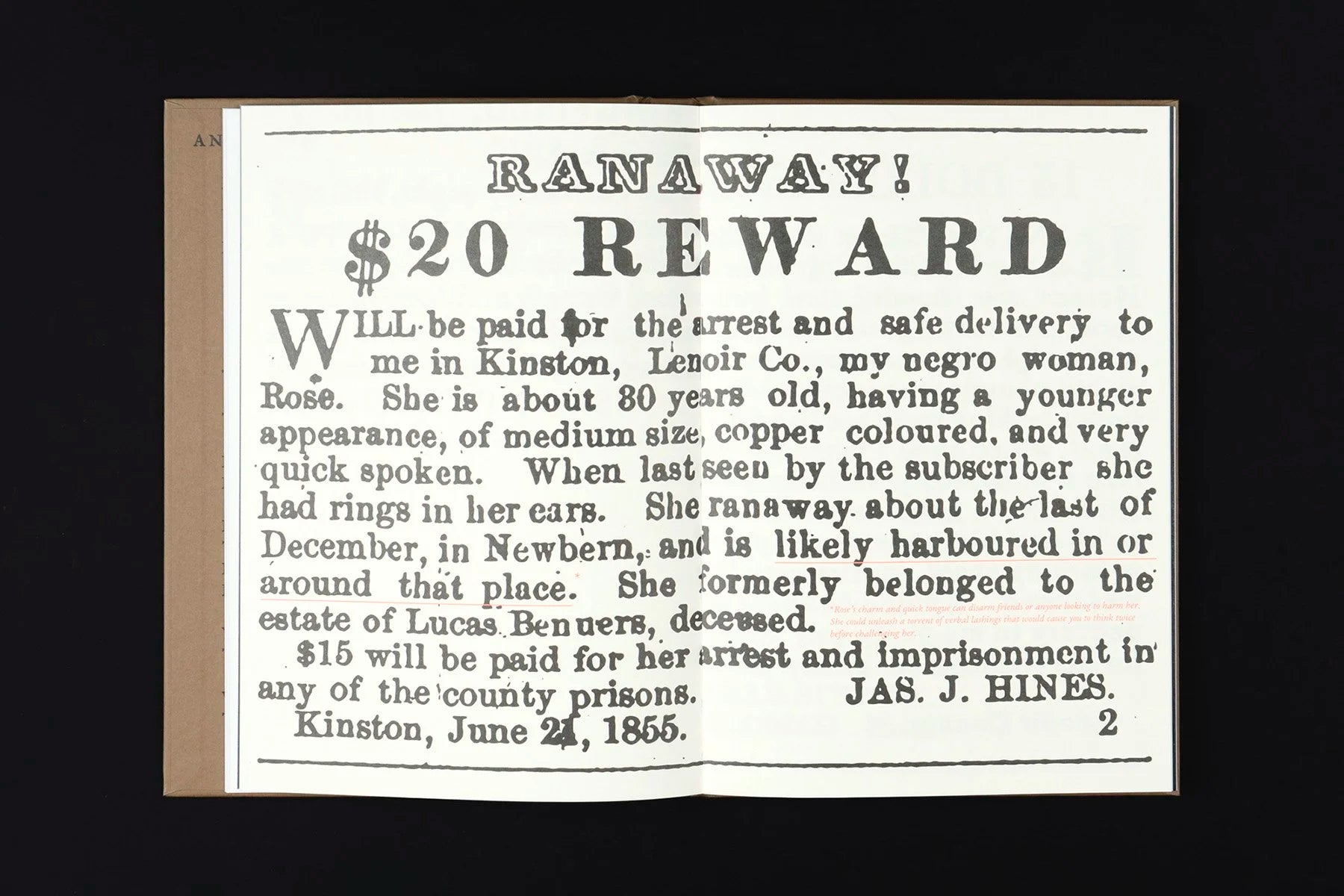 Through the use of archival fragments, historic ephemera and his own photographs, artist Raymond Thompson Jr focuses on previously concealed stories of slaves, maroons, and runaways. ‘It’s hard to stop rebels that time travel’ aims to expand narratives about the Black experience and connection to the ‘American’ landscape. The project is centered around the city of New Bern, North Carolina in the US—established in 1710 as hub for the trade of human beings —an area rich with historic moments. Many maroons—enslaved people who had escaped their captors but chose not flee to the north— inhabited the liminal spaces in the vicinity. They created lives in hard access swamps or in the ungoverned wild spaces between plantations and their survival strategies and techniques can be thought of as ‘freedom practices.’ The materials in the book reach through time to these maroons of the 18th century and connect them to both the contemporary landscape and the viewer. The slim, rectangular design of the book itself, echoes the format of a travel guide or field notebook to be slipped in a pocket to be of use on a journey.