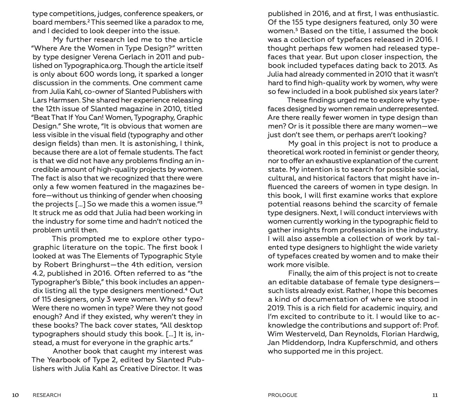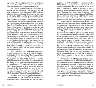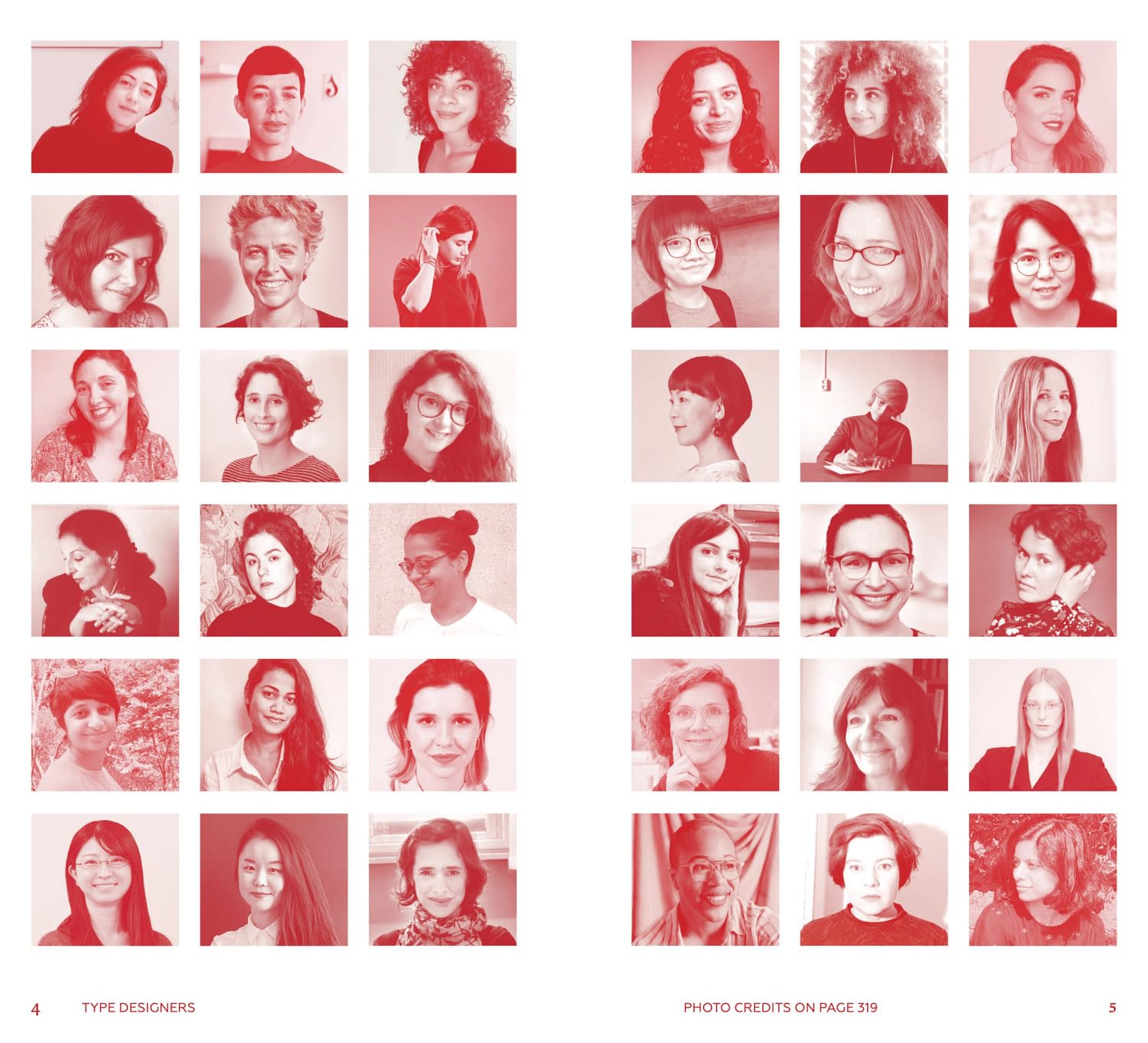 The second portion of the volume comprises a series of interviews with 14 women that are either currently working as type designers or are in other ways involved in the field of type design: Gayaneh Bagdasaryan, Veronika Burian, Maria Doreuli, Louise Fili, Martina Flor, Loraine Furter, Jenna Gesse, Golnar Kat Rahmani, Indra Kupferschmid, Briar Levit, Zuzana Licko, Ana Regidor, Fiona Ross and Carol Wahler. The final section of the book presents a showcase of typefaces designed by women.